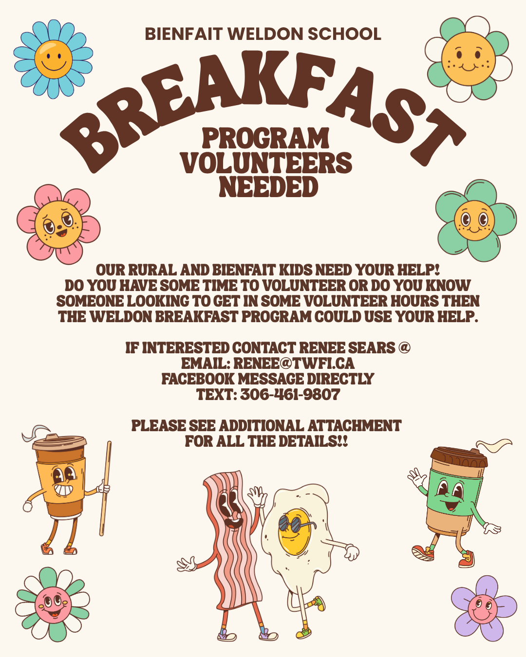 The Bienfait Weldon School is looking for Volunteers to help assist in their breakfast program that feeds K-8 students. This is an important meal to start the day for students and we are in search of more volunteers to help aid this program.